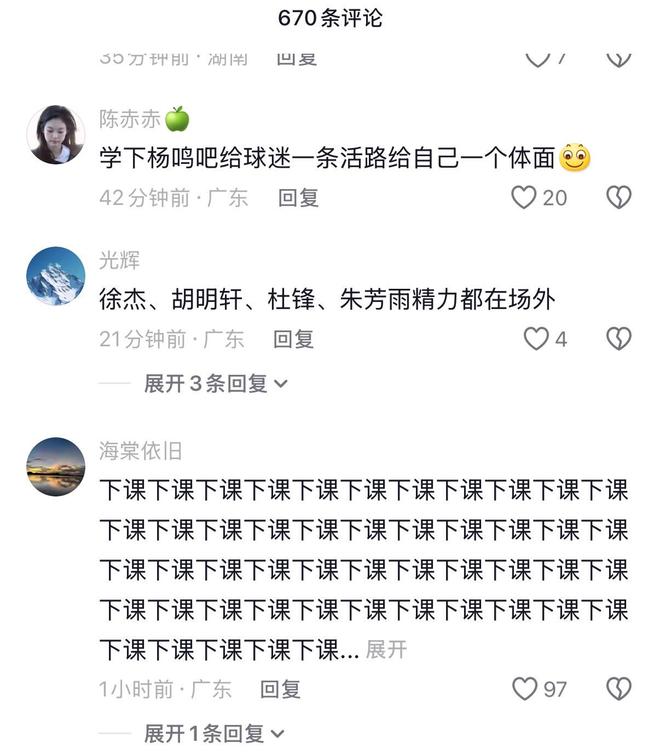 本场比赛杜锋再度让球迷感到绝望。赛前宏远官宣崔永熙复出,本赛季首次全员出战,结果上来球队就被打了一个26-11。杜锋在用人上、战术上、指挥上都彻底被辽篮的乌戈压制,加上历年来杜锋的各种离谱操作,广东球迷对杜锋的不满终于达到了顶点。赛后杜锋的社交媒体评论区一片“下课”呼声。有球迷建议杜锋和朱芳雨一起去找李春江钓鱼,有球迷建议杜锋学一下杨鸣,“给球迷一条活路,给自己一个体面”。也有球迷觉得杜锋最好是专心从政,球队还是交给合适的人接手好了。无论如何,杜锋的宏远教练生涯都到了最危险的地步,不知道陈老板还能忍他到什么时候。