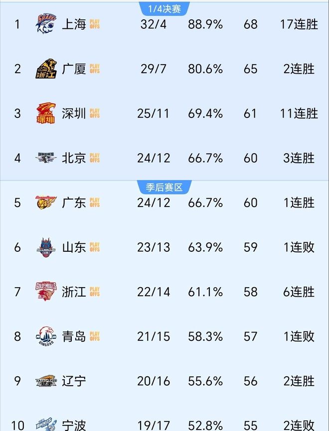 依据最新官方排名,北京队与广东队同为24胜12负,北京凭借微弱小分优势占据第四,广东则暂列第五。