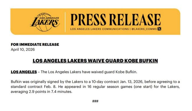 北京时间4月11日,湖人官方宣布裁掉后卫科比-巴夫金。这笔操作将为湖人15人正式大名单腾出一个名额,球队预计在本周末评估填补该名额的人选。北京时间下周一是重新签下第15名球员的截止日——签约必须在湖人常规赛收官战前完成。