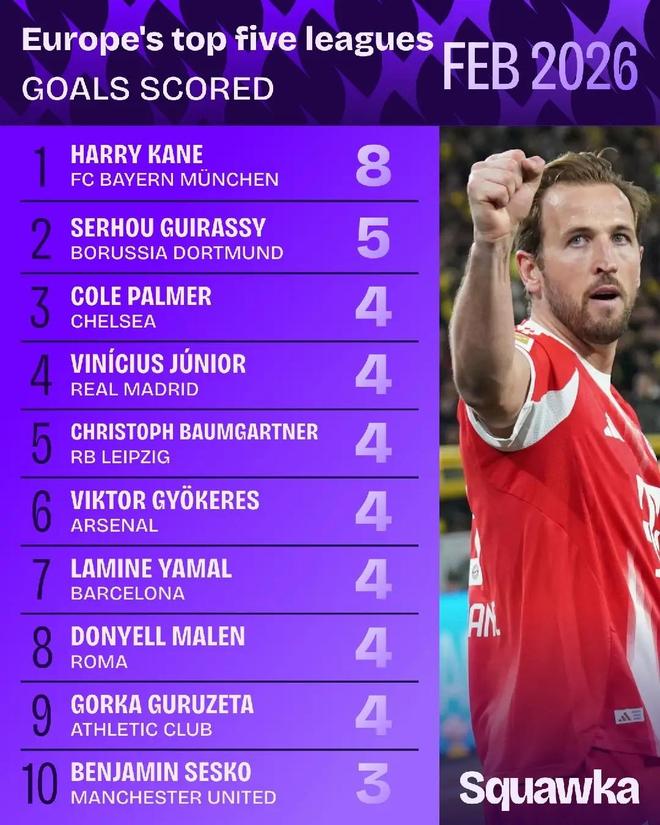 据Squawka统计,拜仁中锋哈里-凯恩在2月的德甲联赛中打入8球,高居五大联赛射手榜之首。多特前锋吉拉西打入5球,位居次席。