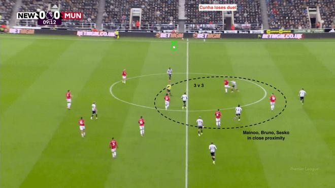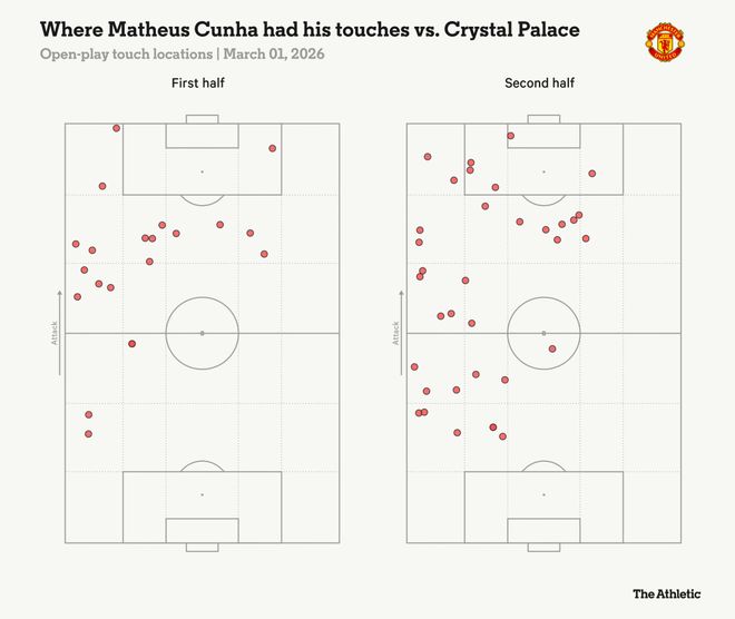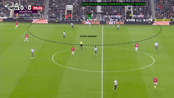 下半场,库尼亚被安排回撤,并且到更靠左的位置接球。他成功跑位接应布鲁诺·费尔南德斯的直塞,博得了扳平比分的点球。