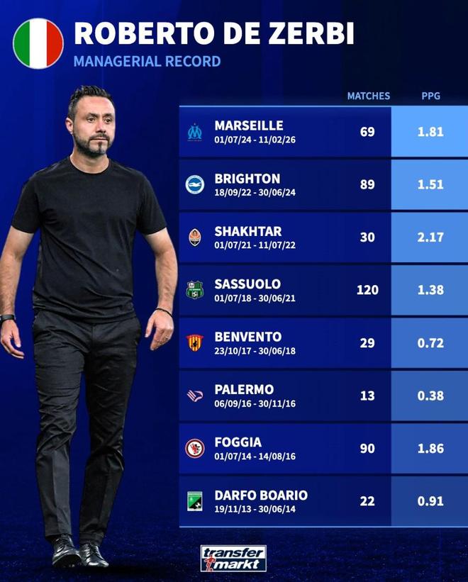 北京时间3月31日,在德泽尔比被认为接近接手托特纳姆热刺的情况下,德转统计出了这位意大利教头教练生涯至今执教各支球队的场均积分,其中最高为顿涅茨克矿工时期的2.17分,布莱顿时期则为1.51分。