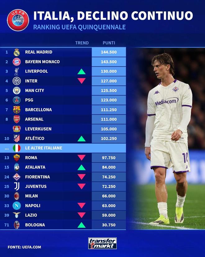 糟糕的欧战表现也影响到了俱乐部及意甲整体的欧战积分情况。
