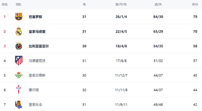 在积分榜上,巴萨遥遥领先。巴萨26胜1平4负,拿到79分。而皇马被远远甩开。皇马只拿到70分,落后了9分,争冠希望极其渺茫。比利亚雷亚尔以58分排名第3。输球的马竞总积分依然是57分,排名第4。皇家贝蒂斯45分排名第5。第6的是塞尔塔,拿到44分。皇家社会以42分排名第7。赫塔费41分排名第8。